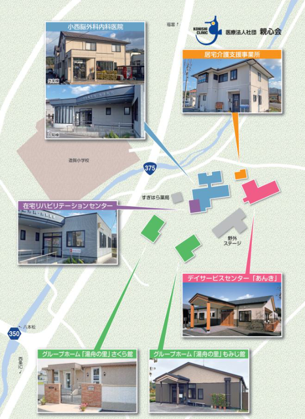 東広島市の中央部に位置する当院の敷地内には、通所・入所・認知症介護に必要な施設があります。
